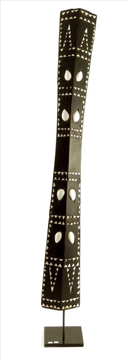 A Maluku shield, Indonesia, of curved angled form, inlaid shell, with integral handle, painted inventory number, 91cm high, on later stand.