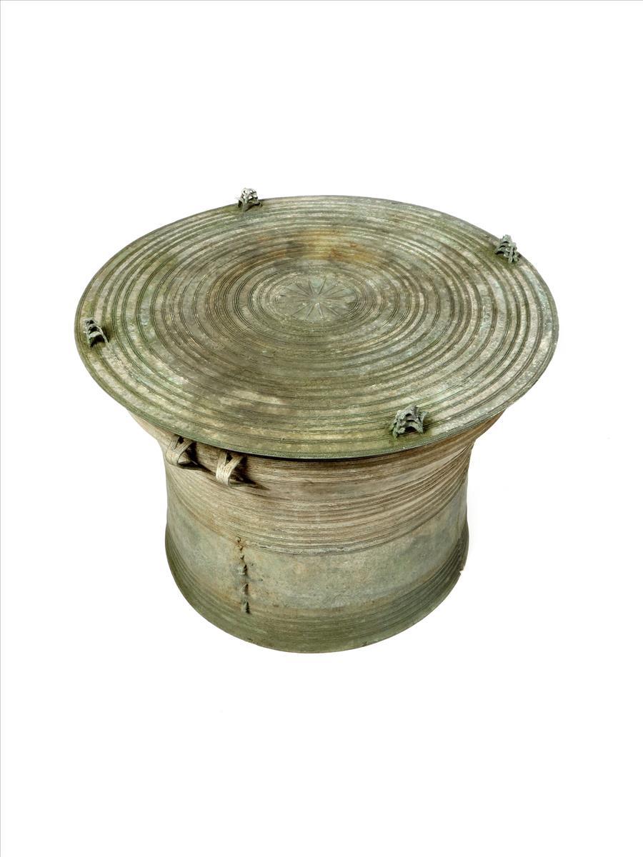 A Sino-Shan bronze 'frog' drum, Laos, the circular top with a central star and reeded bands and stamped decoration, the edge with four groups of three frogs, the sides with two handles and a line of elephants, 51cm high, with a drawing of a drum being played. (2)