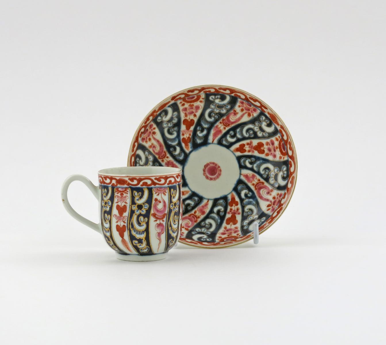 A Worcester coffee cup and saucer c.1770, decorated with the Queen Charlotte pattern, with spiralling panels of stylized flowers, square seal marks, 11.7cm. (2)