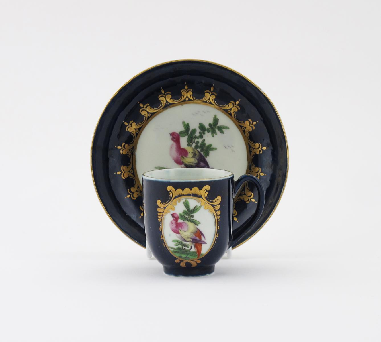 A Worcester coffee cup and saucer c.1770-75, simply painted with exotic birds reserved within gilt borders on a wet blue ground, the cup with a square seal mark, the saucer with a W mark, 13cm. (2)
