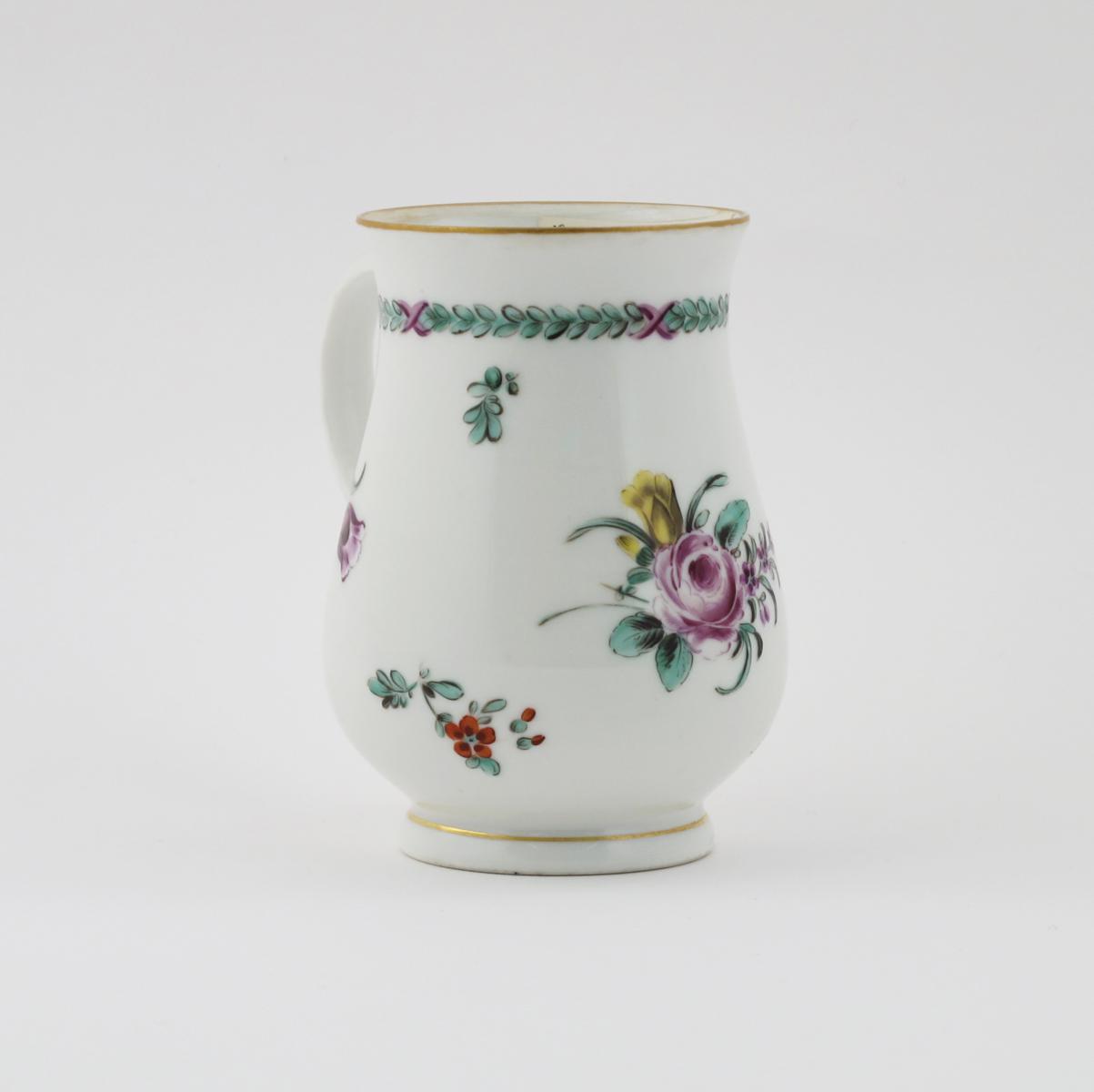 A large Champion's Bristol bell-shaped mug c.1775, simply painted in polychrome enamels with flower sprays beneath a laurel garland border, the grooved strap handle with a puce foliate motif, blue cross mark, 12.5cm.