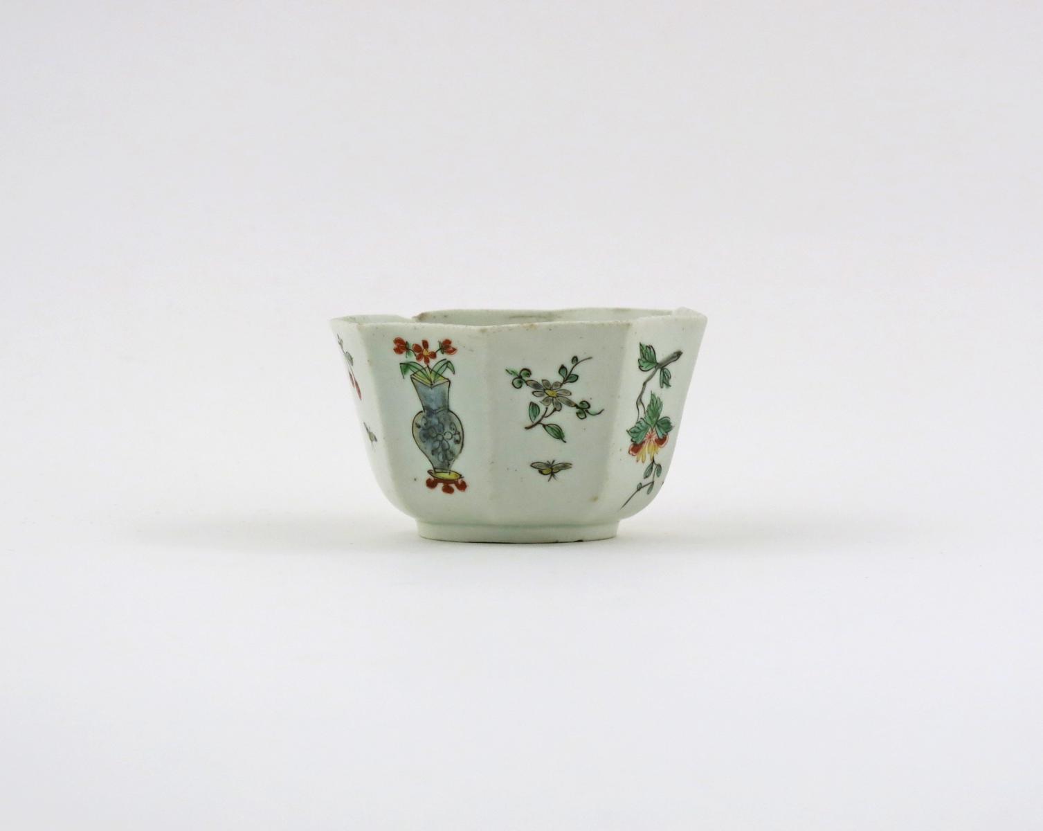 A Worcester octagonal teabowl c.1753-54, painted in the famille vert palette with alternating panels containing flowering branches, vases of flowers, and sprigs of cherries with flying insects, the interior with a stylized flowerhead, 8.8cm dia.
