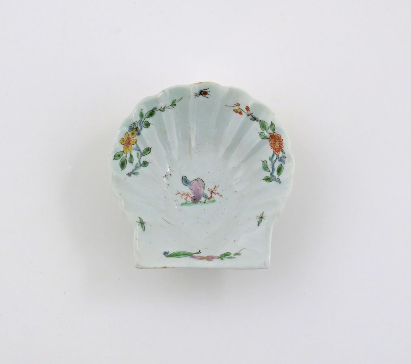 A Worcester shell-shaped pickle dish c.1753-54, formed as a scallop shell and painted with a small shell and seaweed motif to the centre, the fluted border with flowers and insects, 8.5cm.