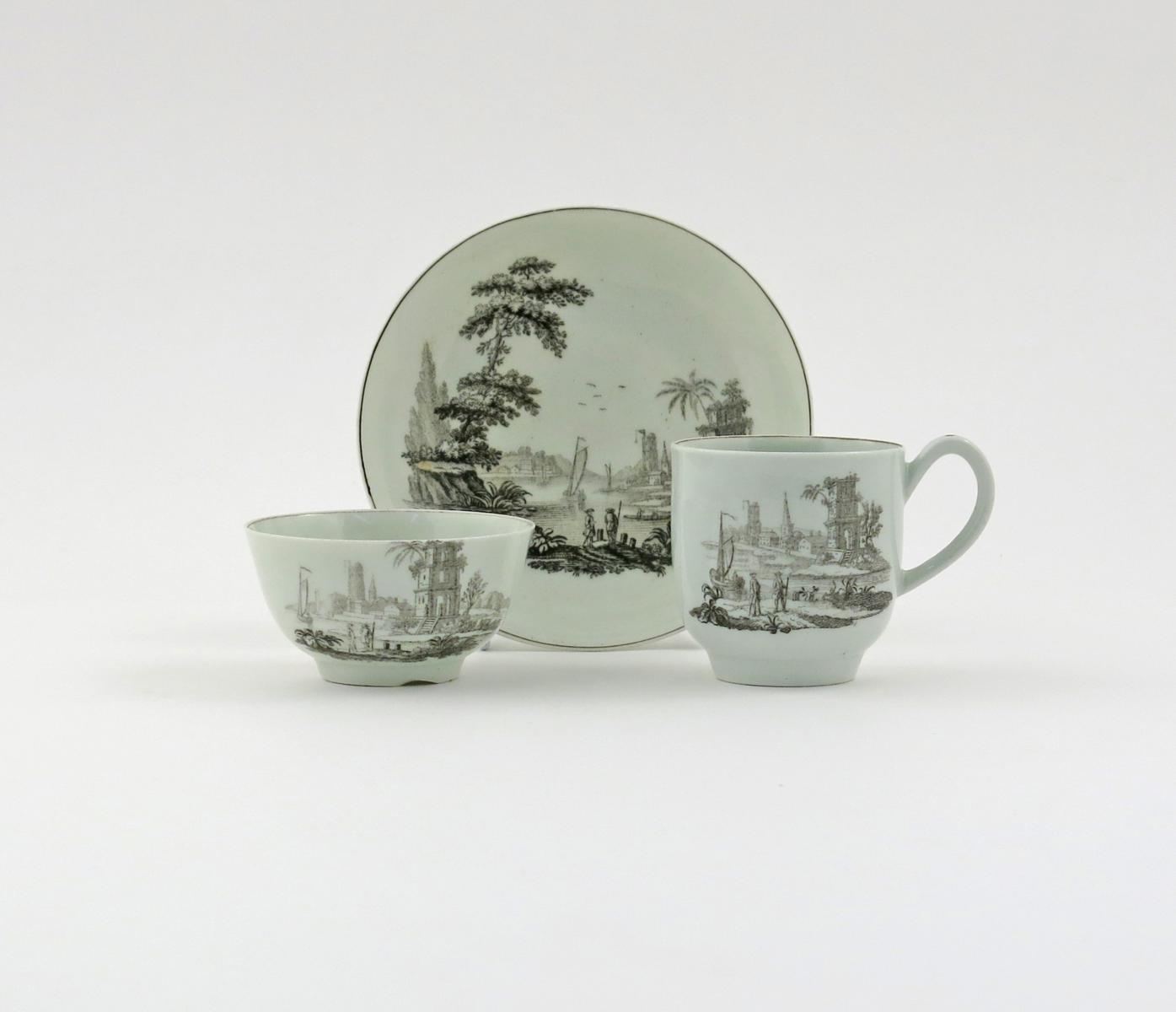 A Worcester trio c.1765, printed in black with The Signal Tower pattern, two figures standing by the waterside with sailing vessels beyond, the tower visible on the right, the reverse of the coffee cup with a traveller before ruins, the teabowl with a fisherman on a low cliff, 12cm. (3)