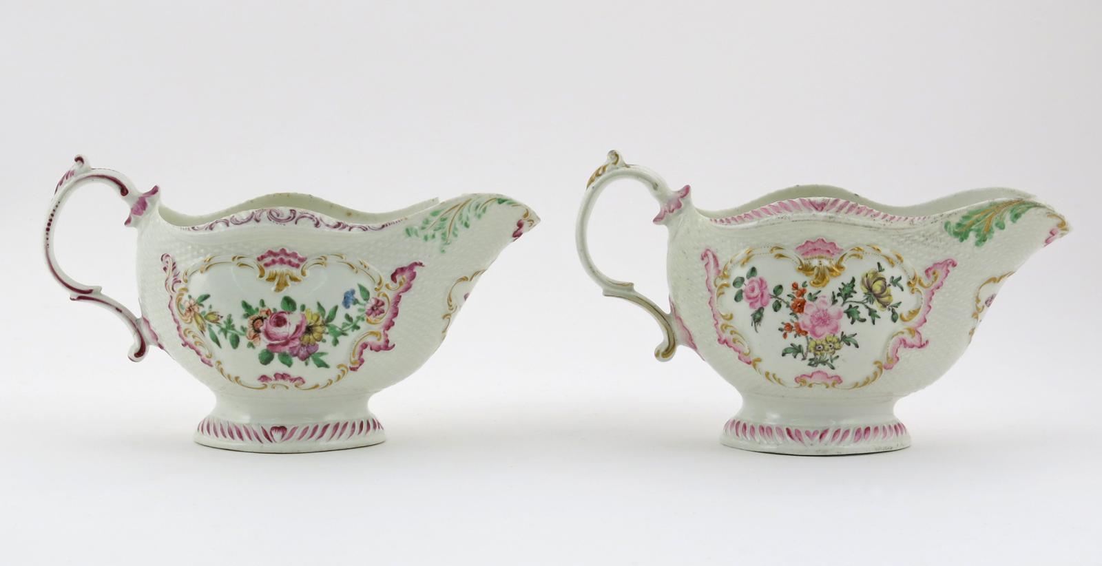 Two rare Worcester sauceboats c.1762, finely enamelled with sprays and garlands of flowers within moulded panels reserved on a basketweave ground, with puce detailing, the interiors painted with further flowers, 20.5cm. (2)