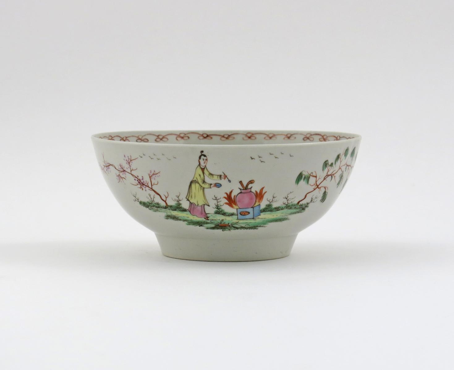 A William Reid bowl c.1756-61, brightly enamelled with a Chinese figure standing beside a large pot over a roaring fire, holding a small bowl and a ladle, the reverse with rockwork and small flocks of birds, 15.7cm.