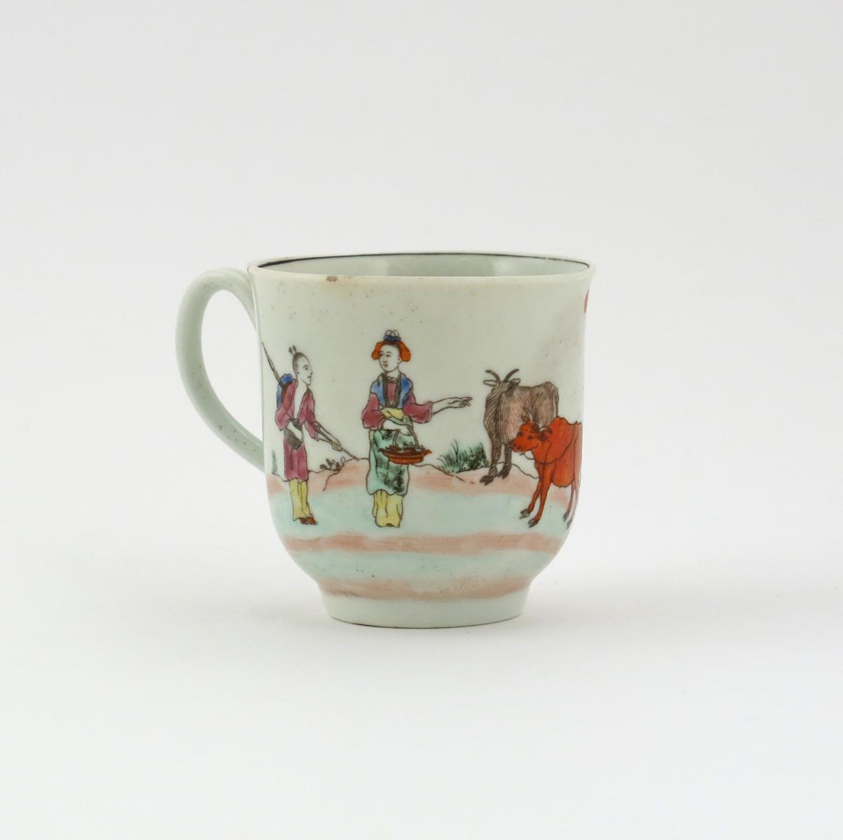 A Worcester coffee cup c.1760, printed and coloured with the Red Bull pattern, the bright oxen beside two Chinese figures in conversation, a third leaning on rockwork to the reverse, 6cm.