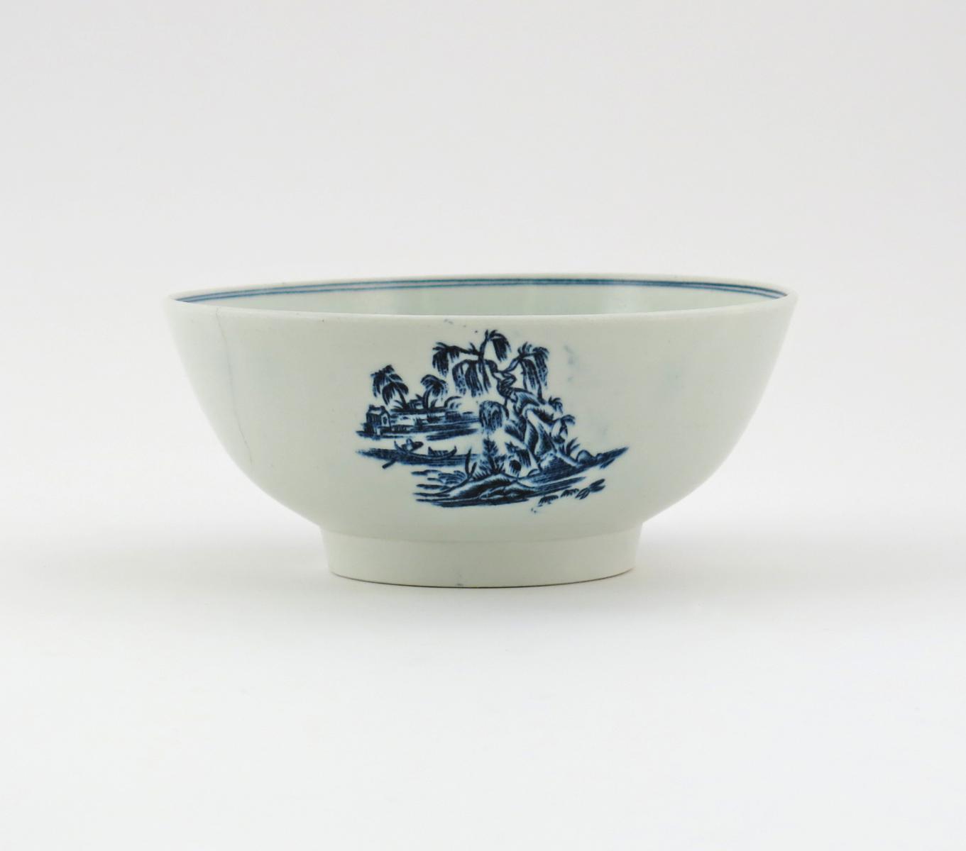 A rare Worcester blue and white bowl c.1758, one side printed with the Fence pattern, the reverse with an unusual small print of Guai-Shi, a figure in a boat beneath willow, 15.2cm dia.