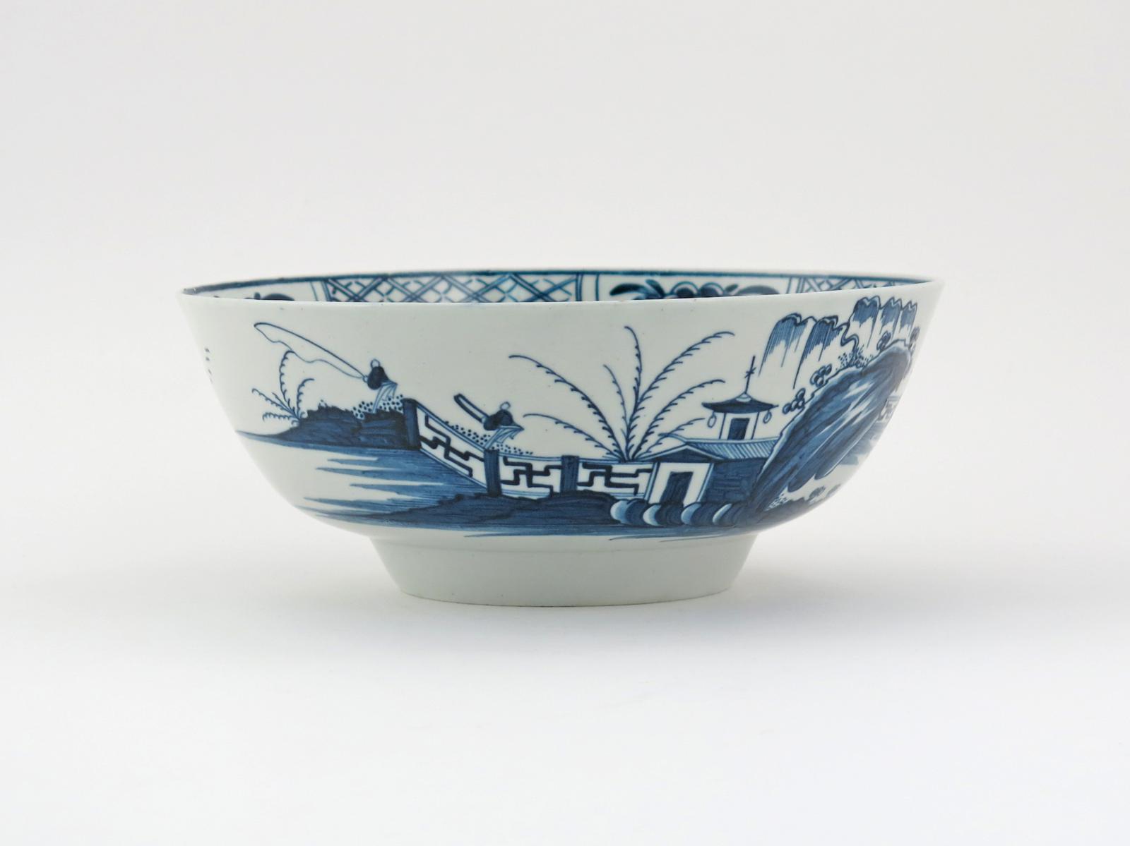A good Christian's Liverpool blue and white bowl c.1765, well painted with two fishermen at the end of a fence, a third figure the other side of a rock promontory from which spouts willow, 20cm dia.