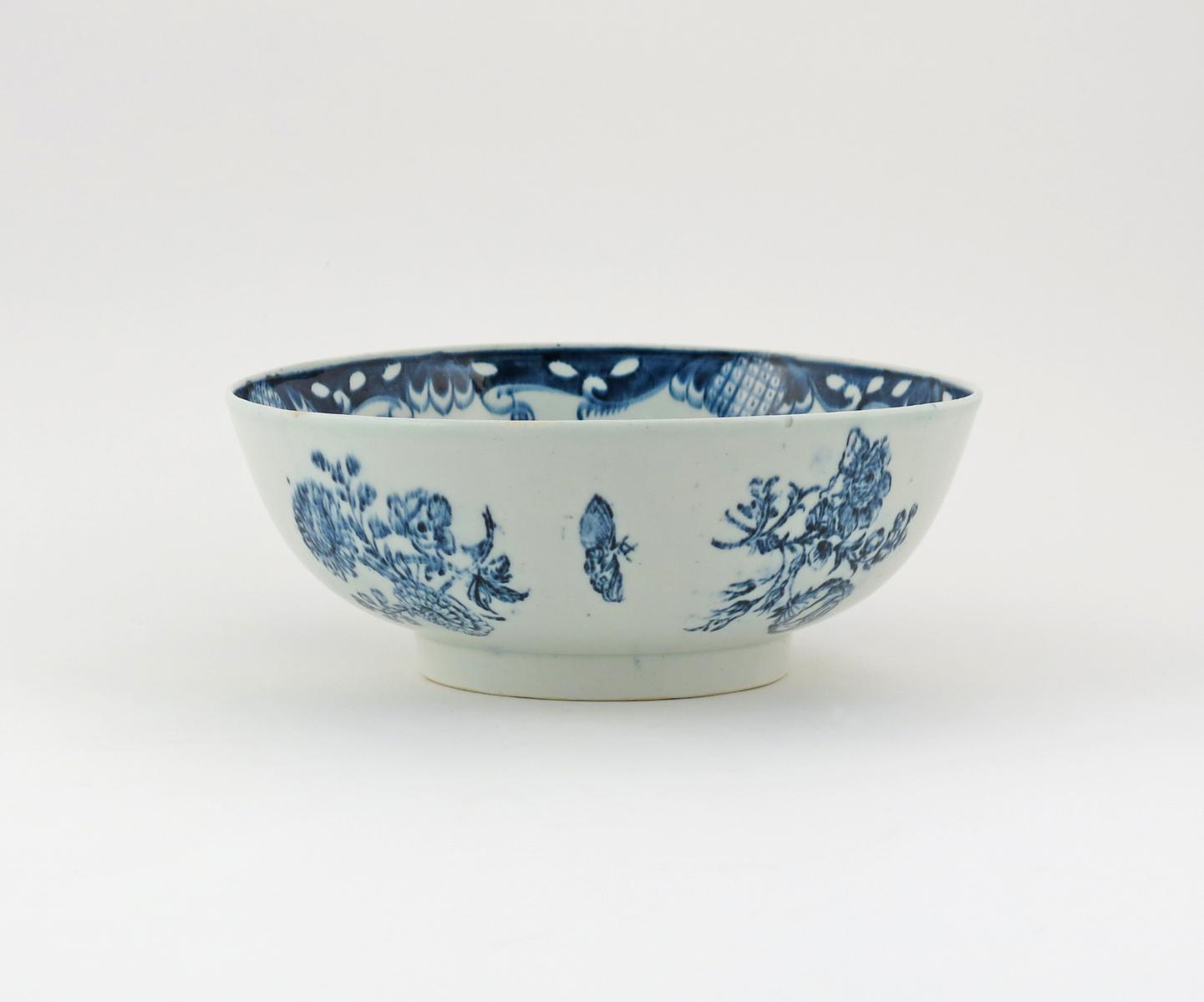 A Lowestoft blue and white bowl c.1770-75, printed with sprays of rose and chrysanthemum with scattered butterflies in flight, the interior with a pineapple border, 20.7cm dia.