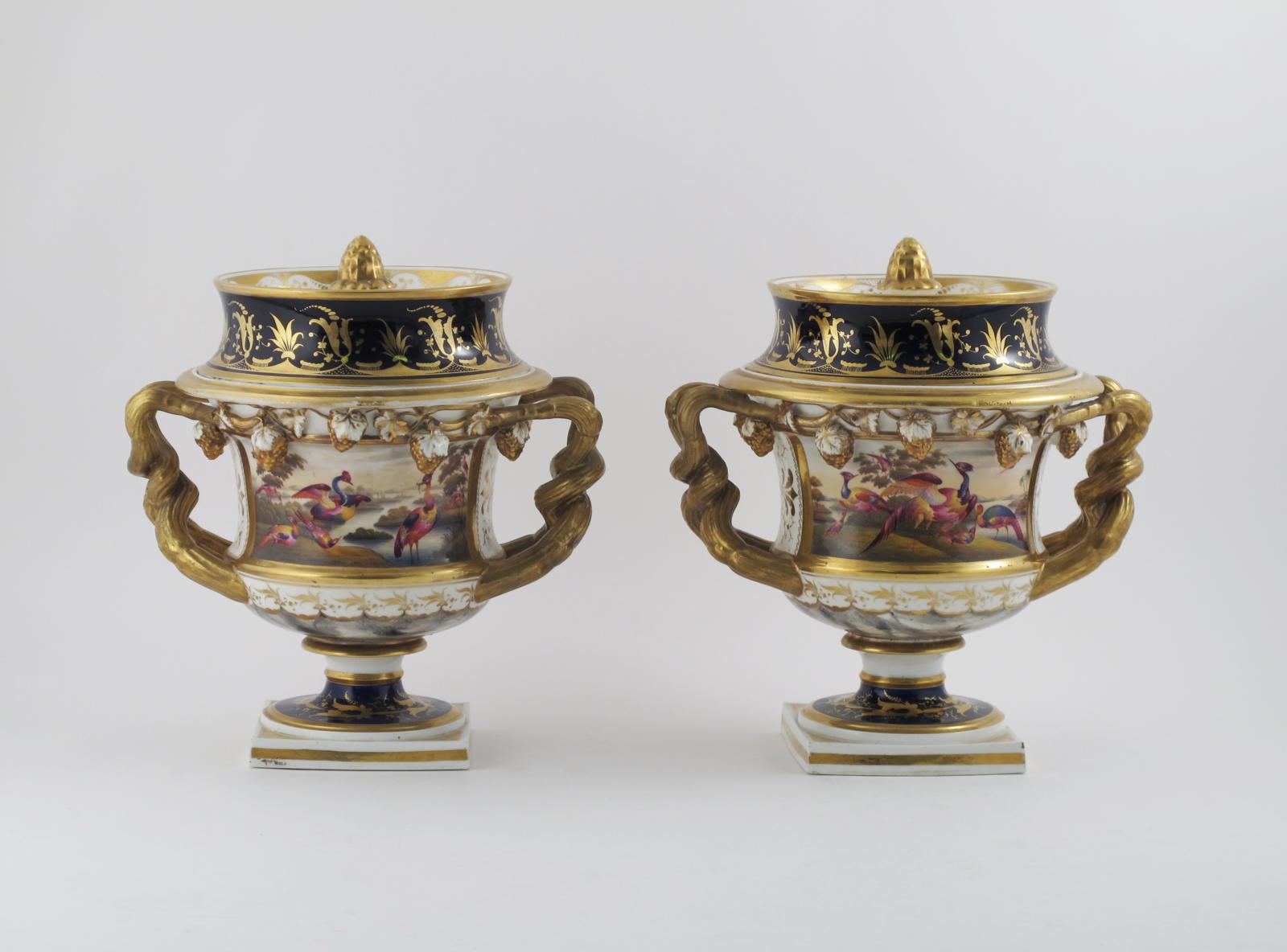 A pair of Chamberlain's Worcester ice pails and covers c.1820-25, painted with panels of peacocks and other exotic birds within gilt foliate designs, the painting attributed to George Davis, the rim hung with a garland of grapes, the intertwined handles formed as branches, the interiors decorated with a marbled effect, 35cm. (4)