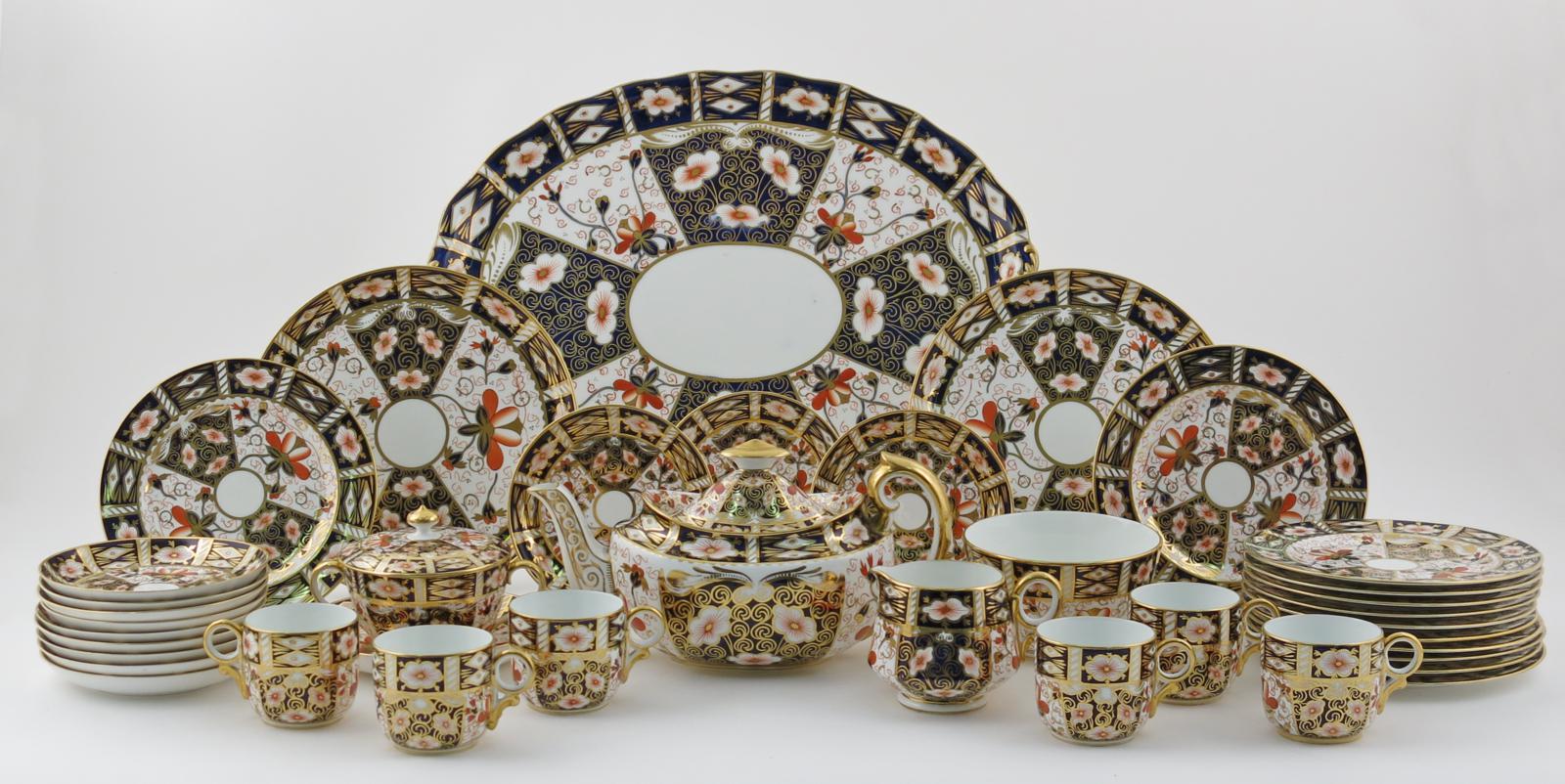 A Royal Crown Derby tea service 1st half 20th century, decorated in the Imari palette in pattern 2451, most with date codes for 1911. Comprising: a tray, a teapot and cover, a sugar bowl and cover, a slop bowl, a stand, a milk jug, two large plates, twelve small plates, twelve saucers and twelve cups. (46)