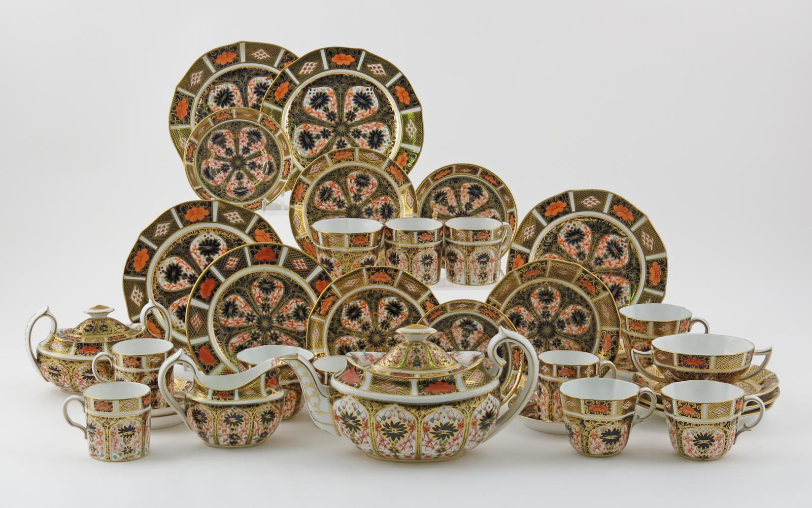 A good Royal Crown Derby tea service 20th century, richly decorated in the Imari palette with leaf-shaped panels of stylized flowers. Comprising: a teapot and cover, a sugar bowl and cover, a milk jug, six cake plates, six tea saucers, six coffee saucers, a small plate, a two-handled cup and saucer, six teacups and six coffee cans. (38)