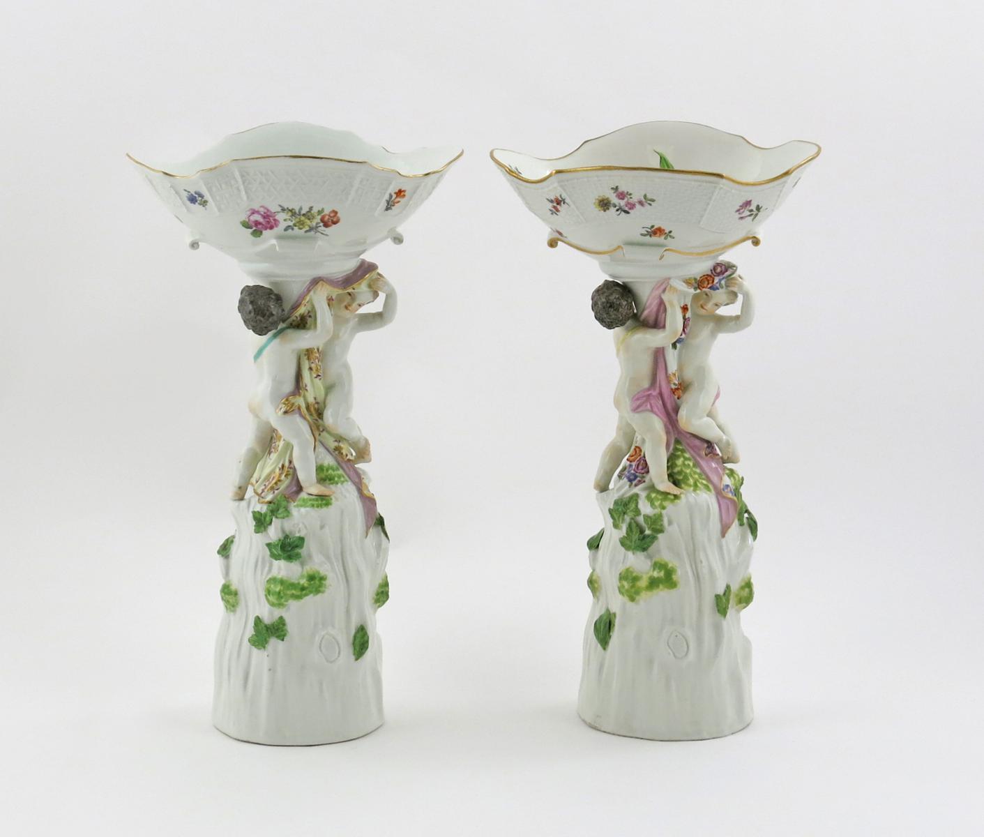 Two large Meissen figural centrepieces mid 18th century, modelled by J. J. Kändler, each with a quatrelobed bowl with basketweave rim supported by two putti standing on a gnarled tree trunk, the bowls painted with flower sprays, blue crossed swords marks, 37cm. (2)
