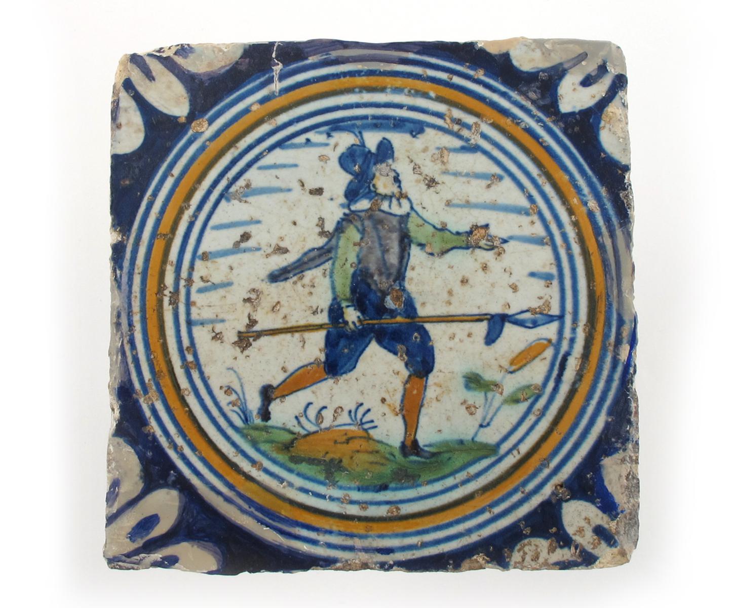 A rare London delftware tile probably Pickleherring Pothouse c.1625, decorated in blue, ochre and green with a figure running with a spear, the corners with petal motifs, 13.3cm.