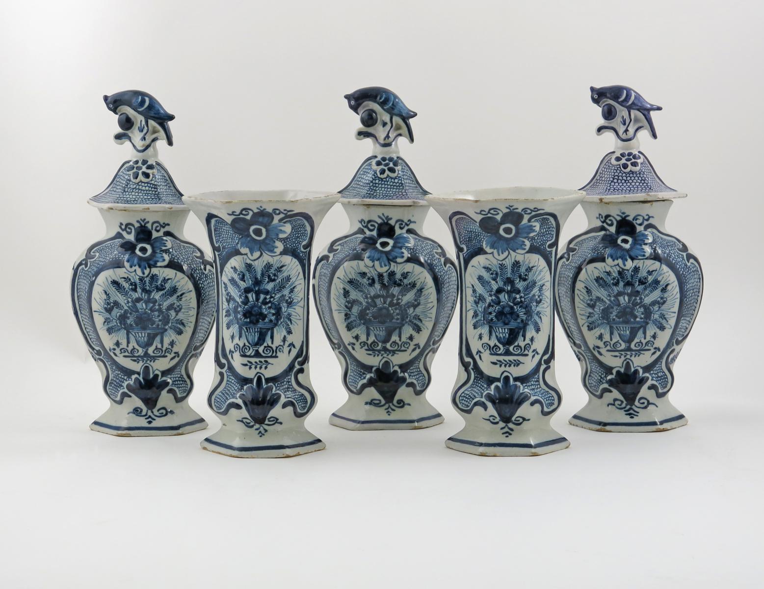 A Dutch Delft garniture of five vases 2nd half 18th century, comprising three covered vases and two flared hexagonal vases, all painted in blue with baskets of flowers and feathers, the covers surmounted with birds, 35cm max. (8)