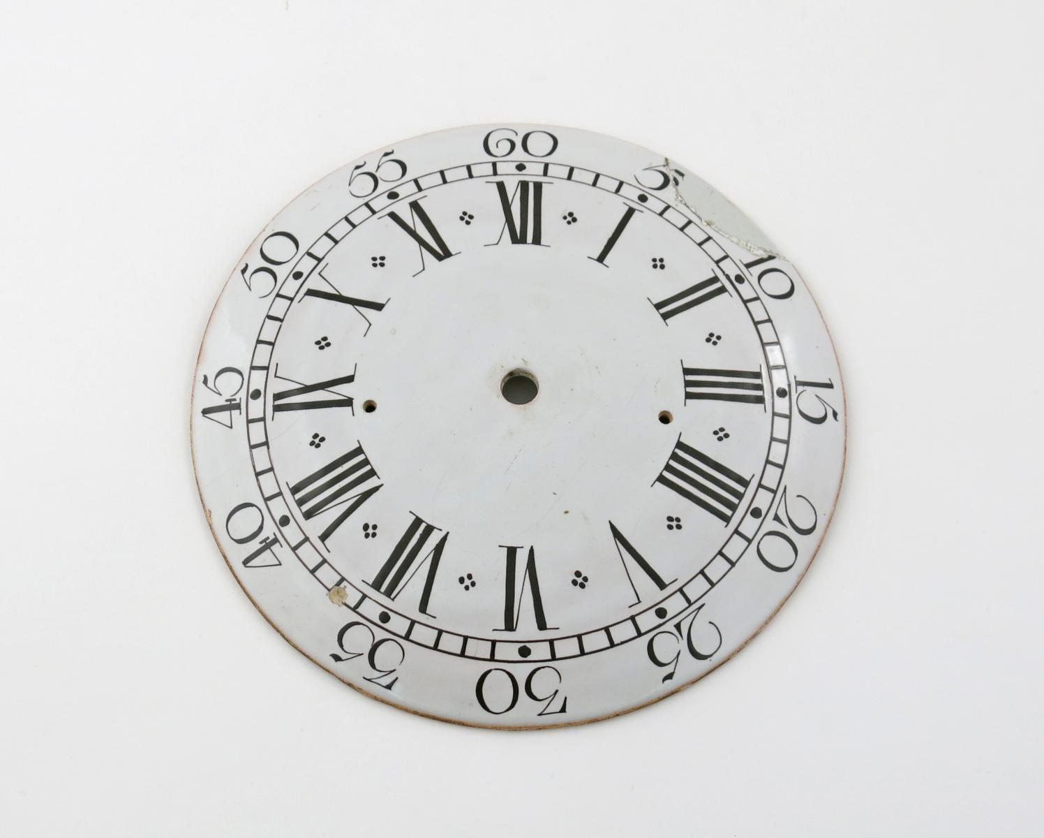 An English delftware clock dial, late 18th century, painted in manganese with Roman numeral hours and Arabic minutes, pierced with three circular holes to the centre, 24cm dia.