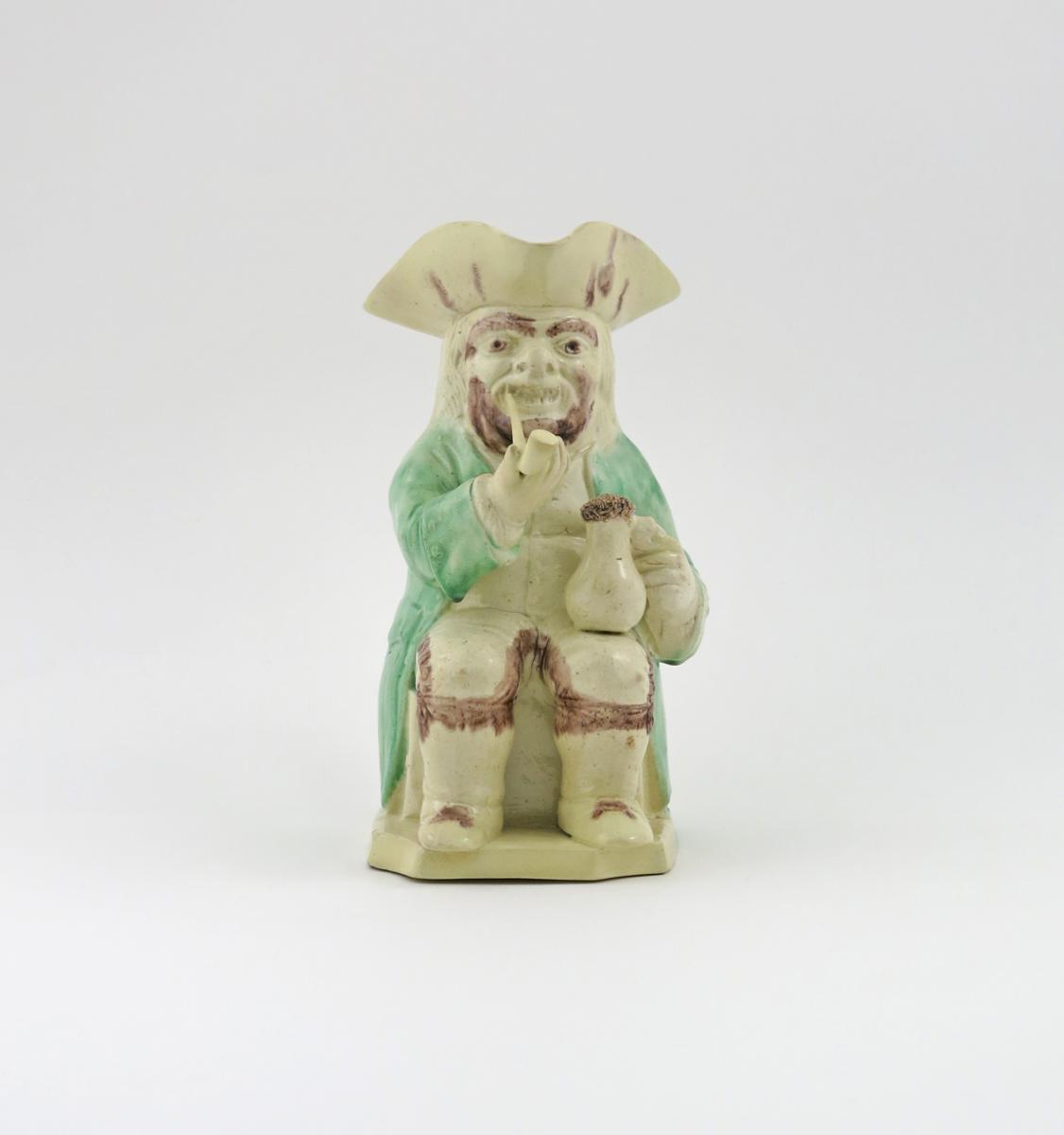 A creamware Step or Twyford Toby jug c.1780, decorated in Whieldon type glazes with a manganese beard and eyebrows, his coat washed in pale green, a long-stemmed pipe supported in his right hand, a pear-shaped jug of ale on his knee, 24cm.