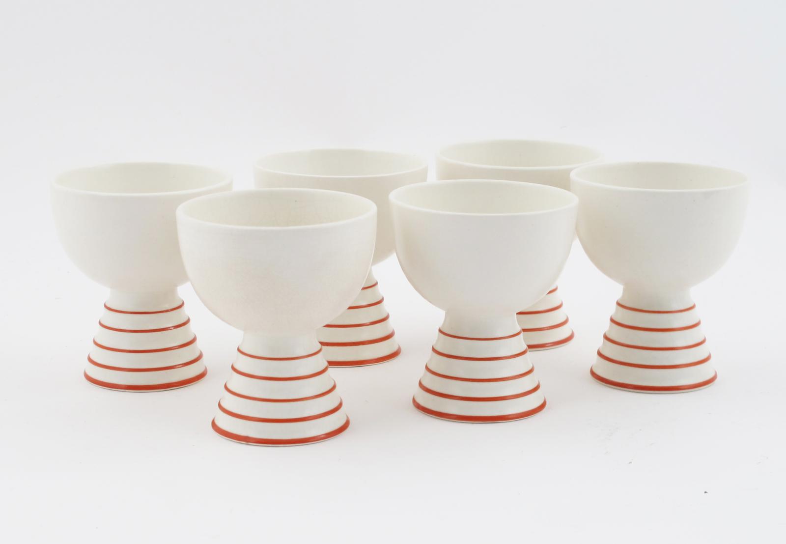 A set of Wedgwood Moonstone cocktail goblets designed by Keith Murray, the ribbed foot decorated with red enamel bands printed marks, KM monogram 7.5cm. high
