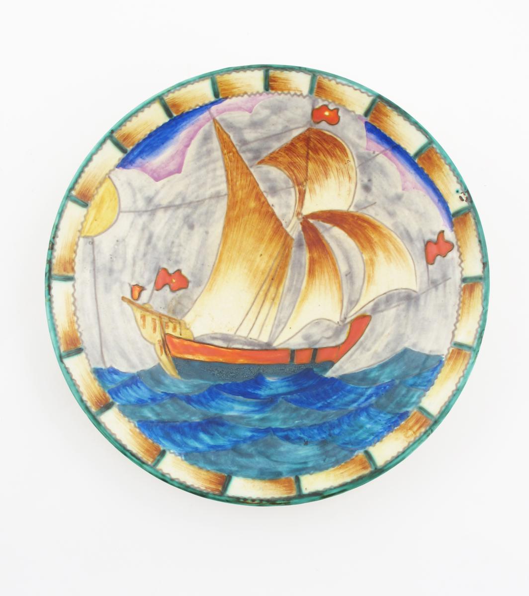 A Crown Devon wall charger, pattern M.93, tubeline decorated with a galleon at full sail, in colours on a pale yellow ground printed and painted marks, original paper label 30cm. diam.