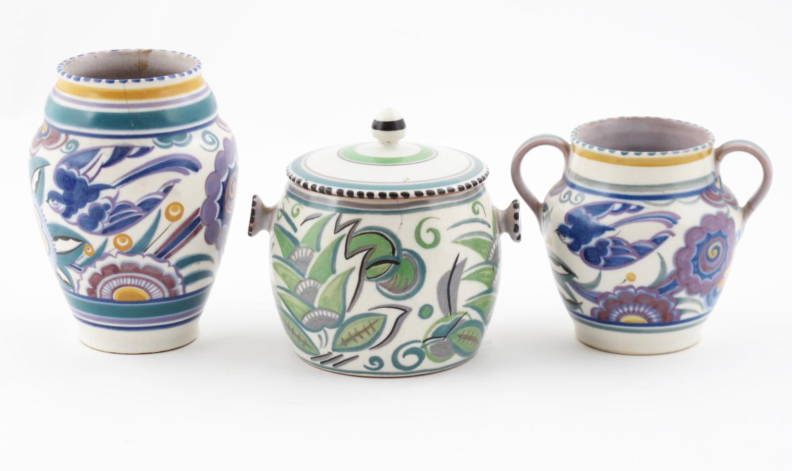 A Poole Pottery biscuit barrel and cover, pattern GPA, painted with geometric flowers and foliage in shades of green, grey and black on a white ground, two Poole Pottery bluebird vases and three other items impressed and painted marks, damages 15cm. high