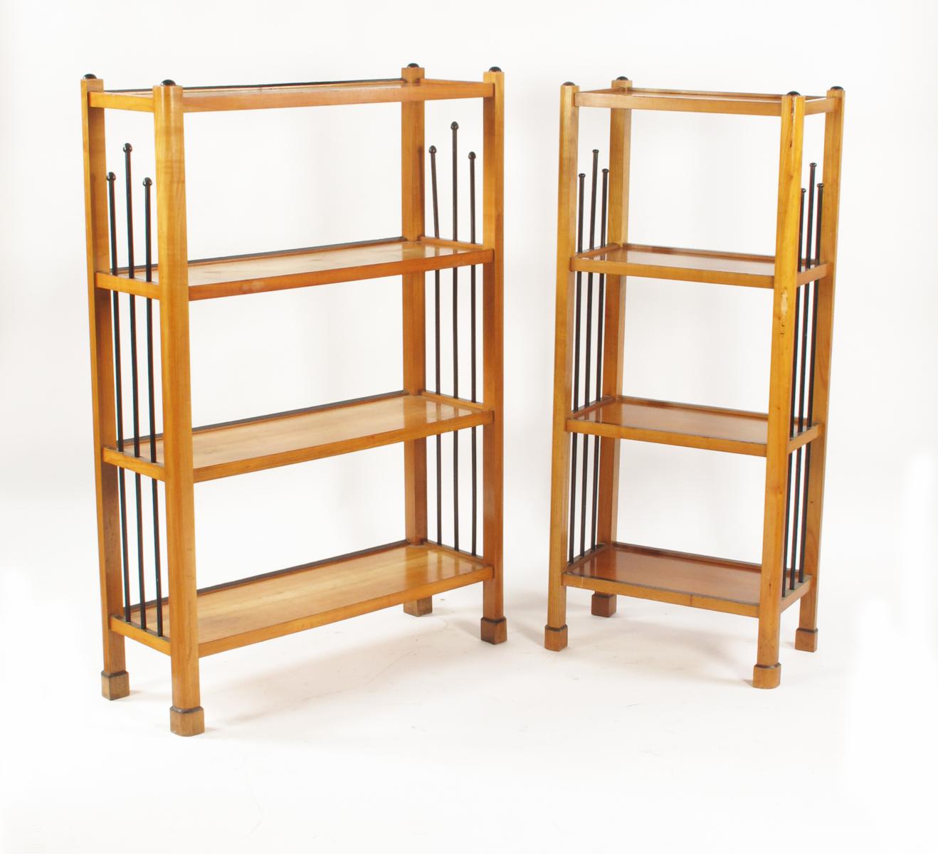 A Biedermeier style fruitwood bookshelf, rectangular with ebonised wood rod decoration, and another smaller, 128cm high, smaller bookshelf 125cm high