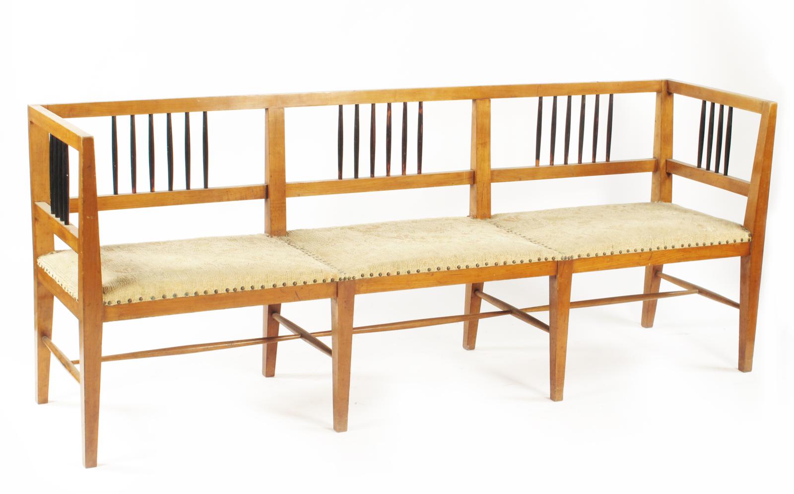 A Biedermeier style fruitwood settee, with ebonised rod decoration, upholstered seat 201cm wide