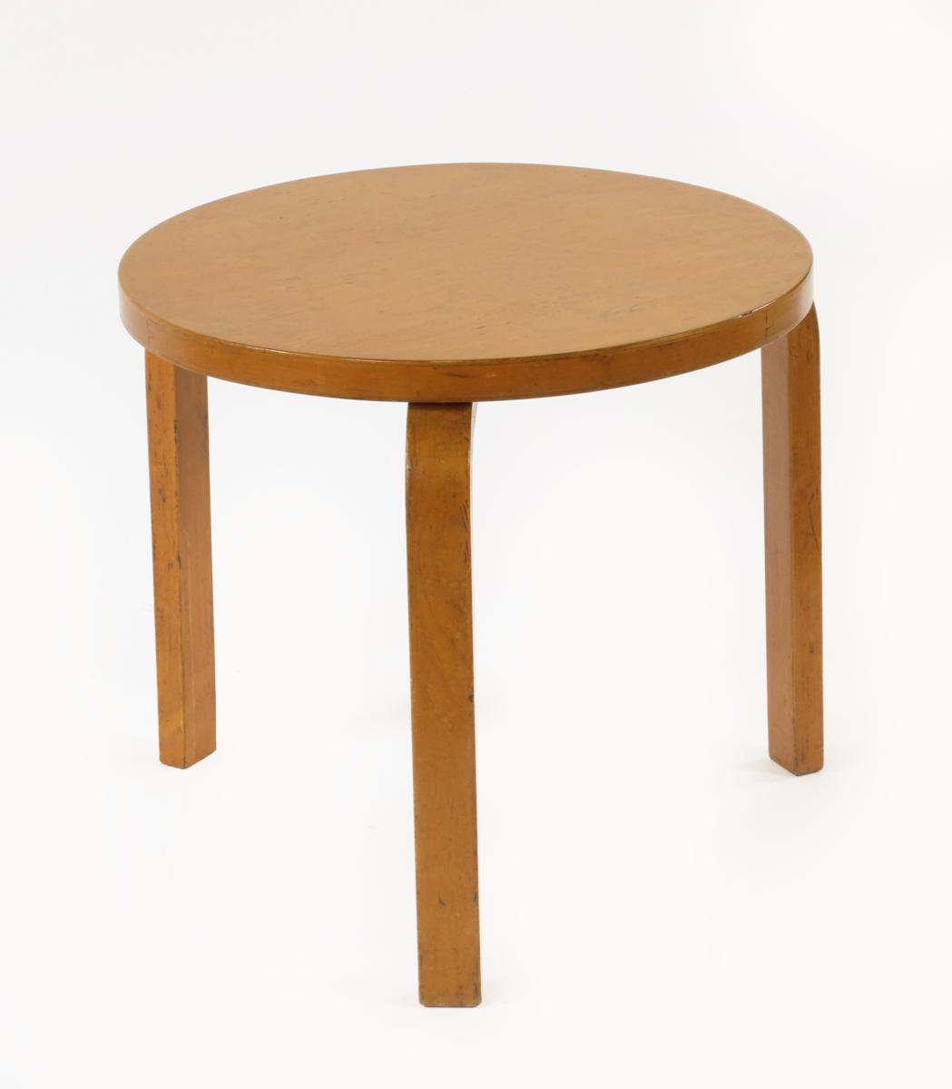 A Finmar walnut occasional table designed by Alvar Aalto, circular top on three bentwood legs applied label 48cm diam, 44cm high