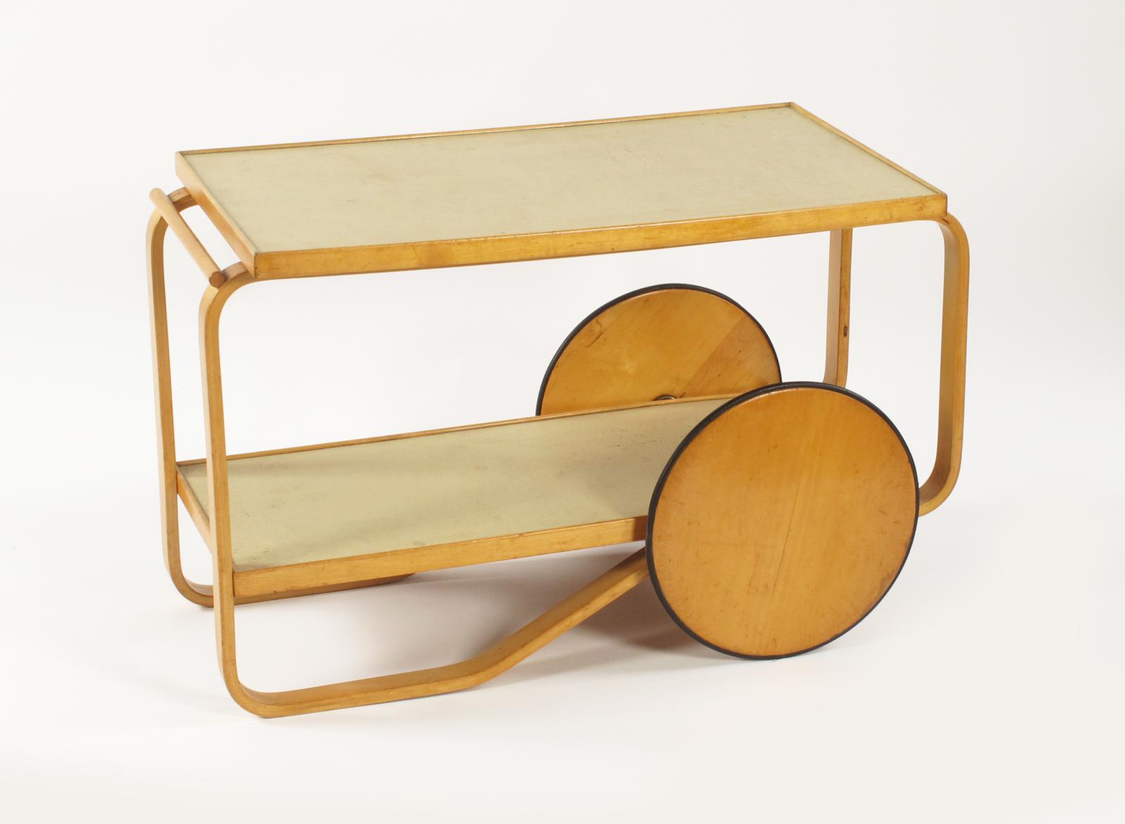 A Finmar beech drinks trolley designed by Alvar Aalto, model no.98, applied label 88cm wide, 56cm. high