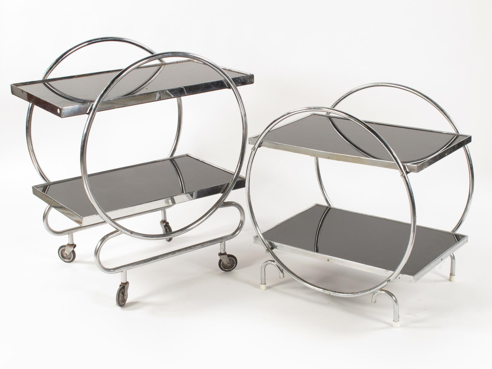 A chrome and black glass two tier table, rectangular black glass shelves, circular tube frame, and a serving trolley similar, 68cm. high