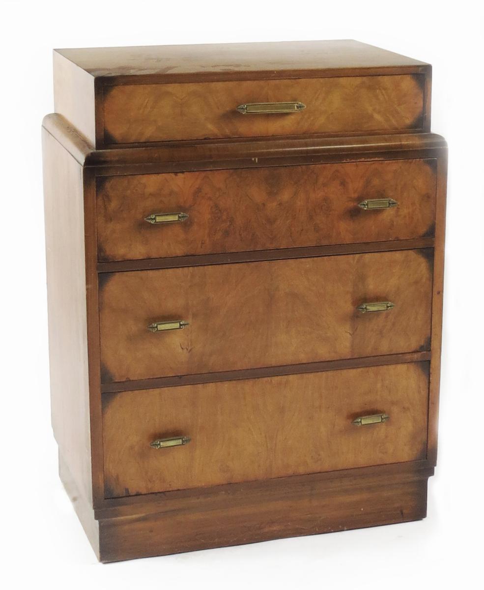 An Art Deco walnut chest of drawers, with stepped top and brass furniture 91cm. high