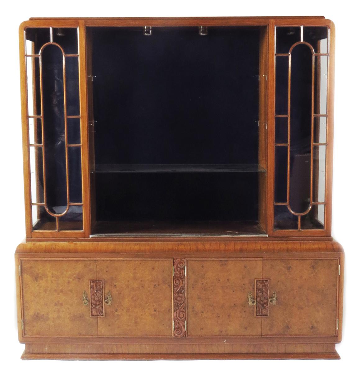 A C.W.S Ltd Art Deco walnut display cabinet, central shelved display with sliding glass doors, flanked with side access shelves applied label 168cm. wide