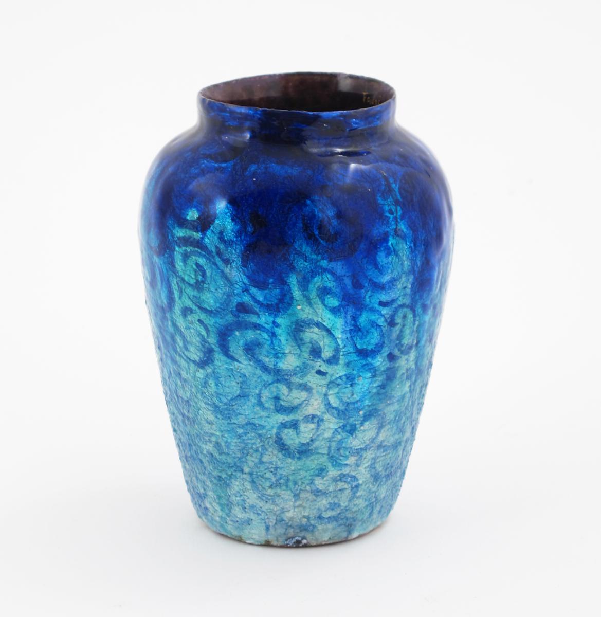 A small Faure enamelled copper vase, shouldered form, enamelled with scroll design on graduated blue ground signed to top rim 10cm. high