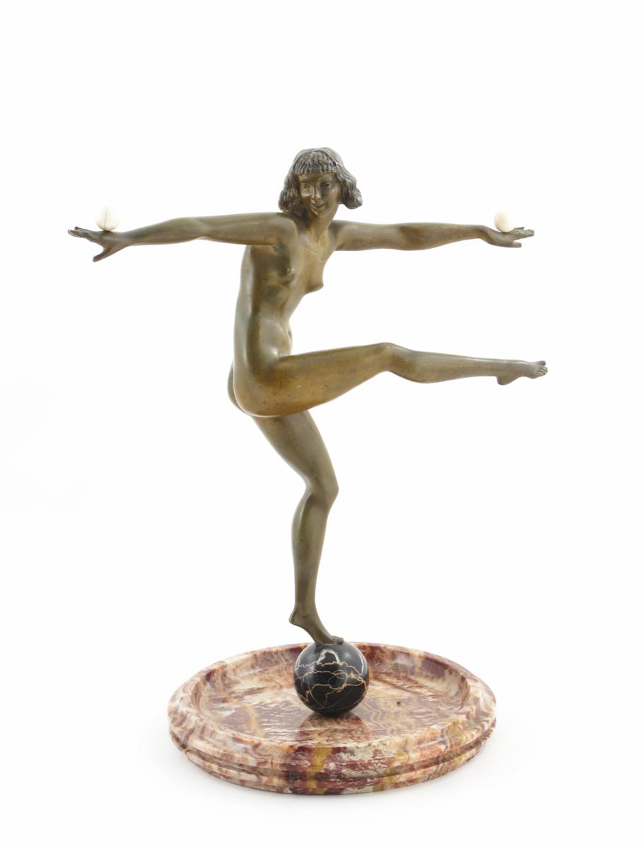 λ A patinated bronze model of a dancer cast from a model by Marcel-Andre Bouraine, modelled her arms outstretched balancing ivory balls on her hands, balancing on black veined marble ball set on red marble tray signed Bouraine to the ball, 42cm. high
