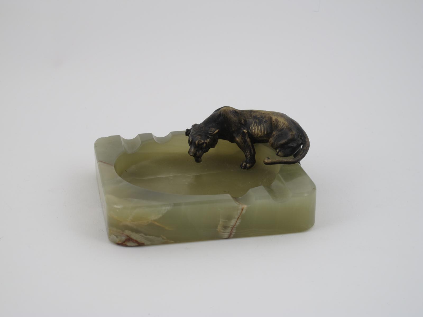A patinated bronze model of a lioness drinking from a pool, on green onyx base 16cm wide