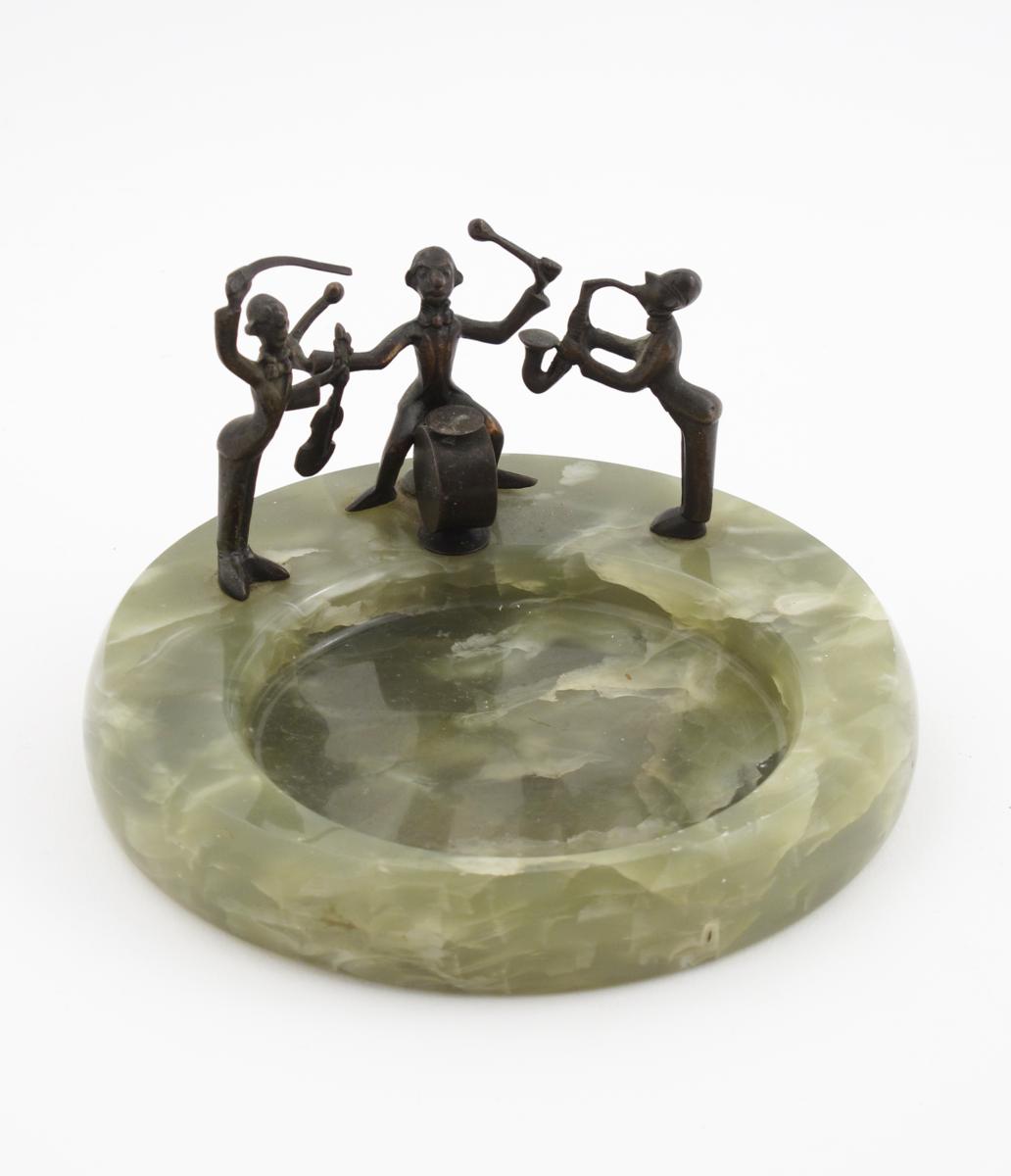 A patinated bronze group of three Jazz musicians, modelled as African American musicians, mounted on green onyx base, unsigned 14.5cm. diam.