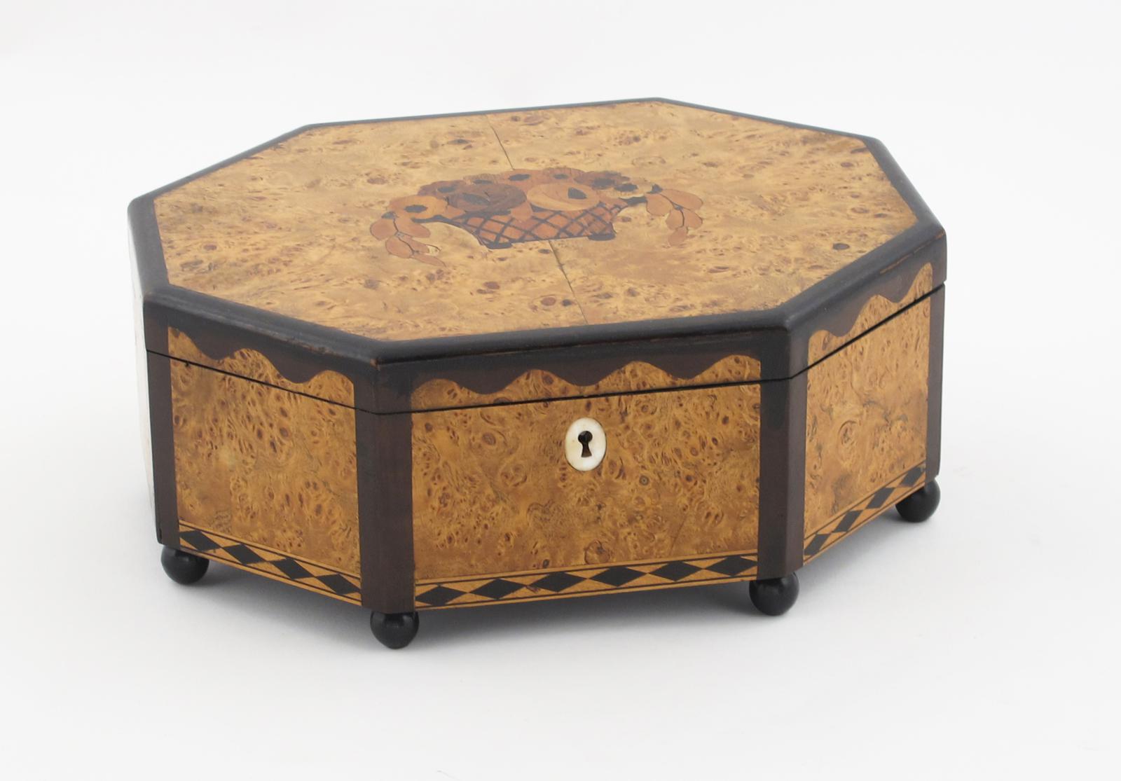 λ An Austrian burr thuya inlaid box and cover, octagonal form on ball feet, the cover inset with marquetry floral panel, the keyhole set with ivory unsigned 26cm. wide