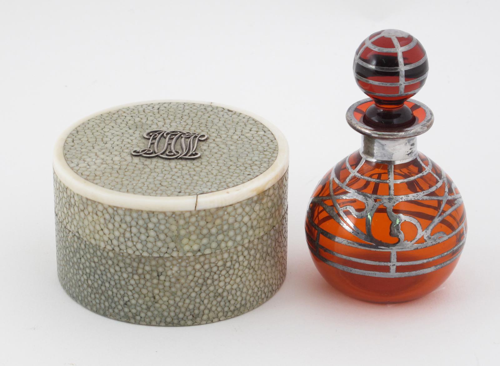 λ A shagreen and ivory mounted wooden box, circular section, the cover inset with white metal initials MHH, and a silver mounted red glass perfume bottle and stopper unsigned