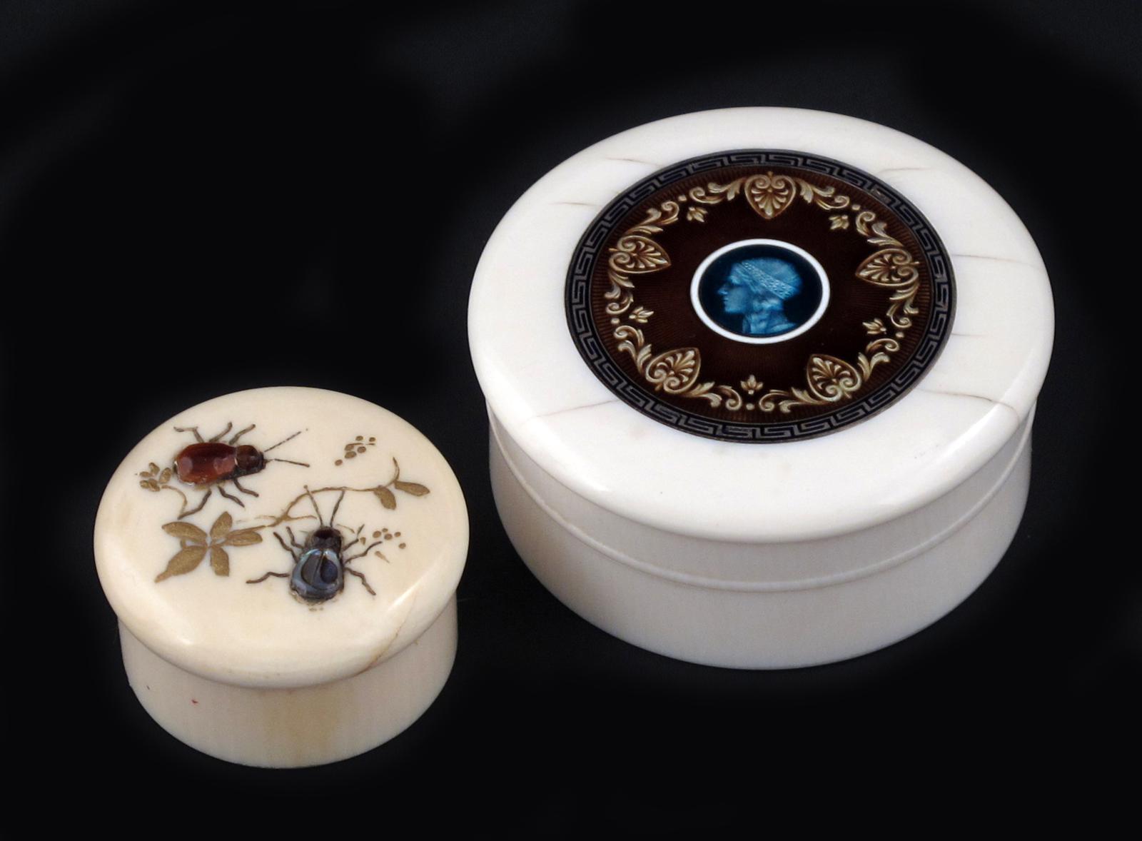 λ A small ivory box and cover, circular section the cover inset with an enamel portrait roundel, inside stylised foliate and Greek Key border, and a Japanese small ivory box and cover decorated with insects unsigned 6cm. diam.