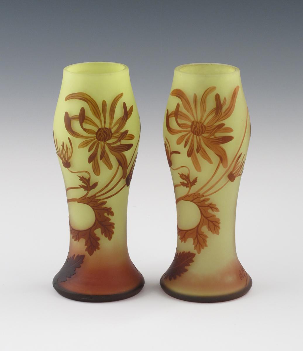 A pair of Richards cameo glass vases made by Loetz, swollen cylindrical form, decorated with honeysuckle in orange on a yellow ground, cameo signature Richards 26cm. high