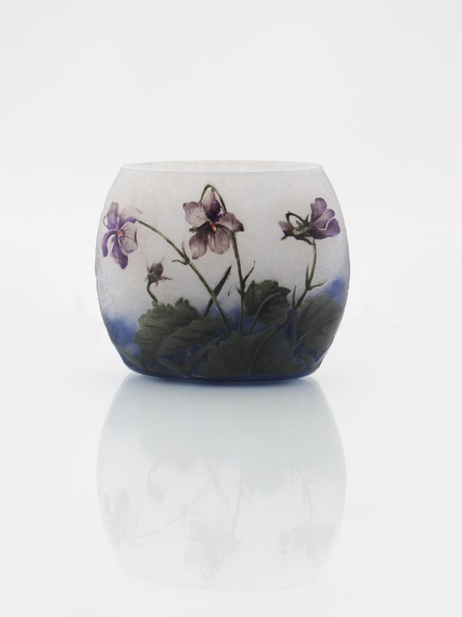 A Daum Nancy enamelled glass vase, elliptical form, enamelled with violets, in purple and green on a mottled ground cameo Daum Nancy France signature 8.5cm. high