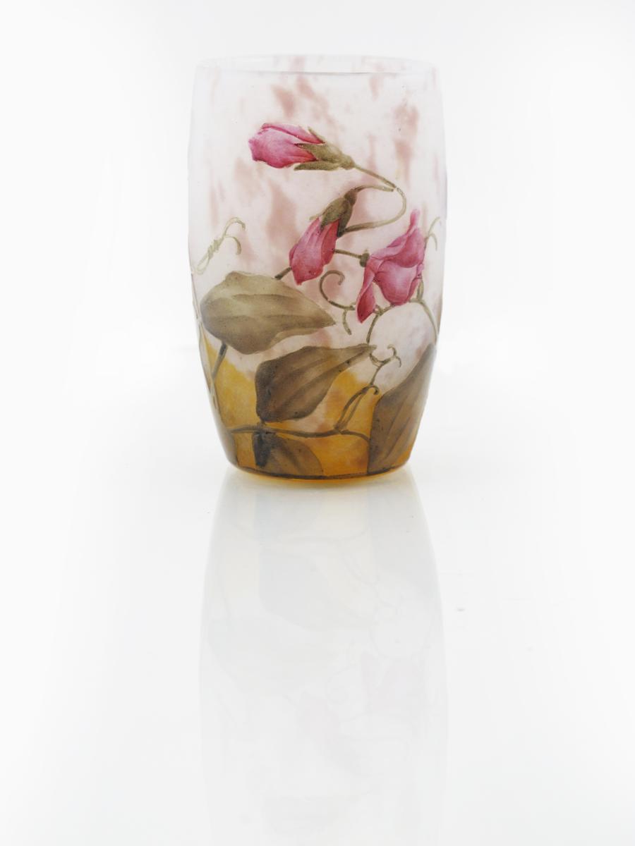 A Daum Nancy enamelled glass beaker vase, enamelled with sweet-peas in pink and green on a mottled ground cameo Daum Nancy mark 9cm. high