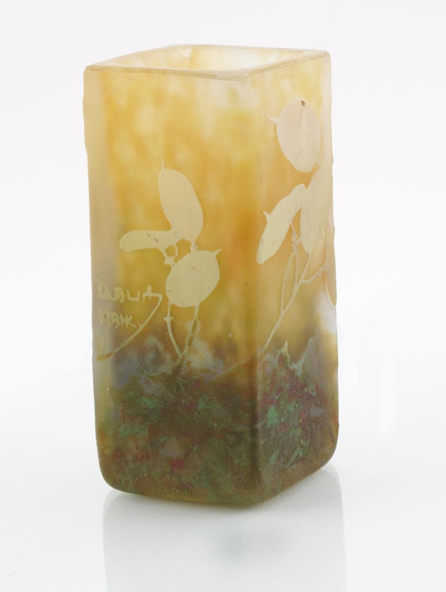 'Monnaie du Pape' a Daum Nancy cameo glass vase, square section, decorated in low relief with honesty stems, cameo signature 12cm. high