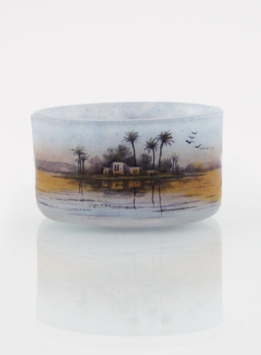 A rare Daum Nancy miniature enamelled glass vase, elliptical section, painted with a tropical scene of houses before palm trees painted Daum Nancy mark, 5cm. wide
