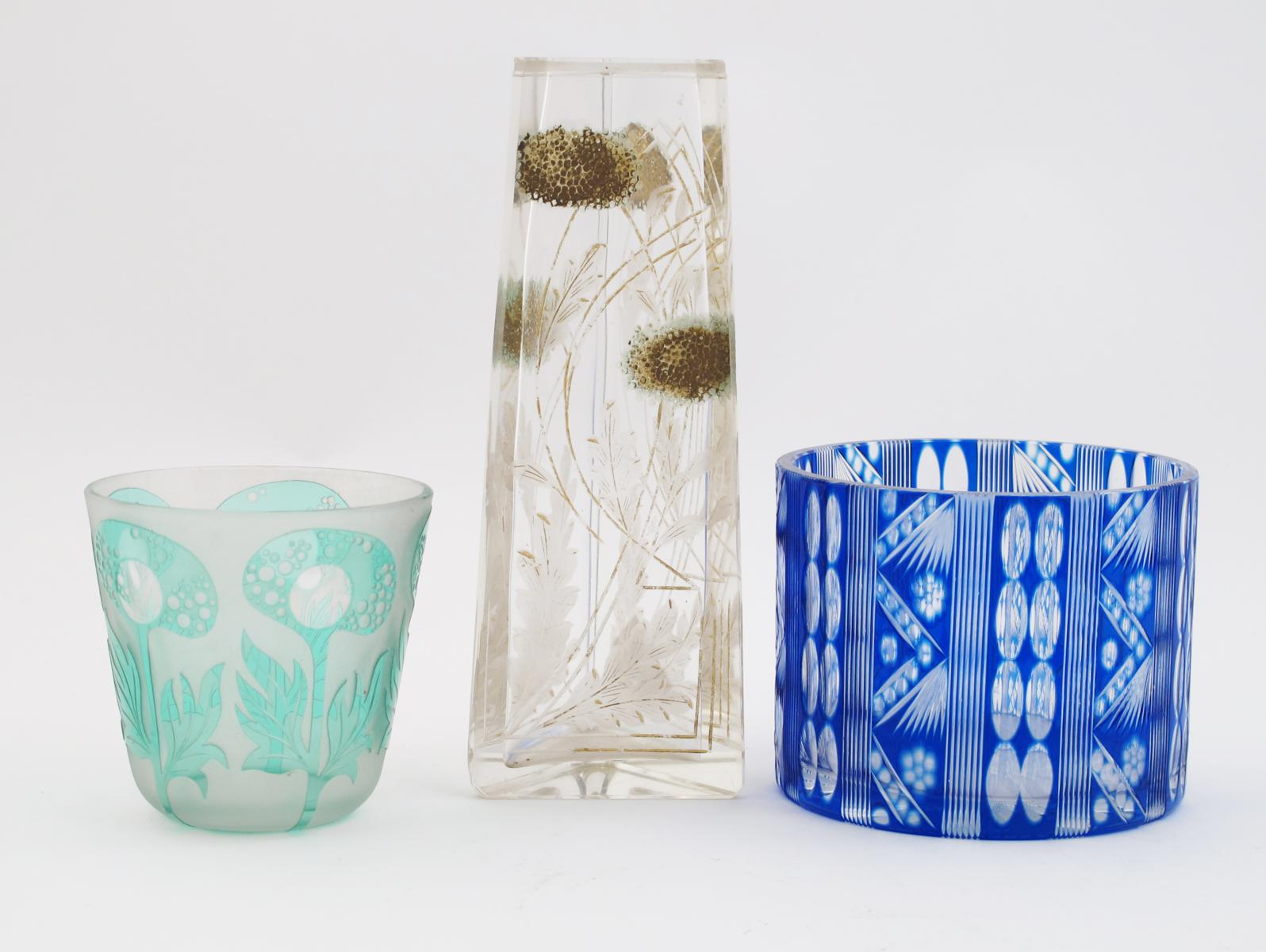 Am Art Nouveau Moser etched glass vase, flaring triangular section, etched with flower stems, highlighted in gilt, a blue overlaid glass vase in the manner of the Wiener Werkstatte and another overlay glass beaker vase unsigned 18.5cm. high