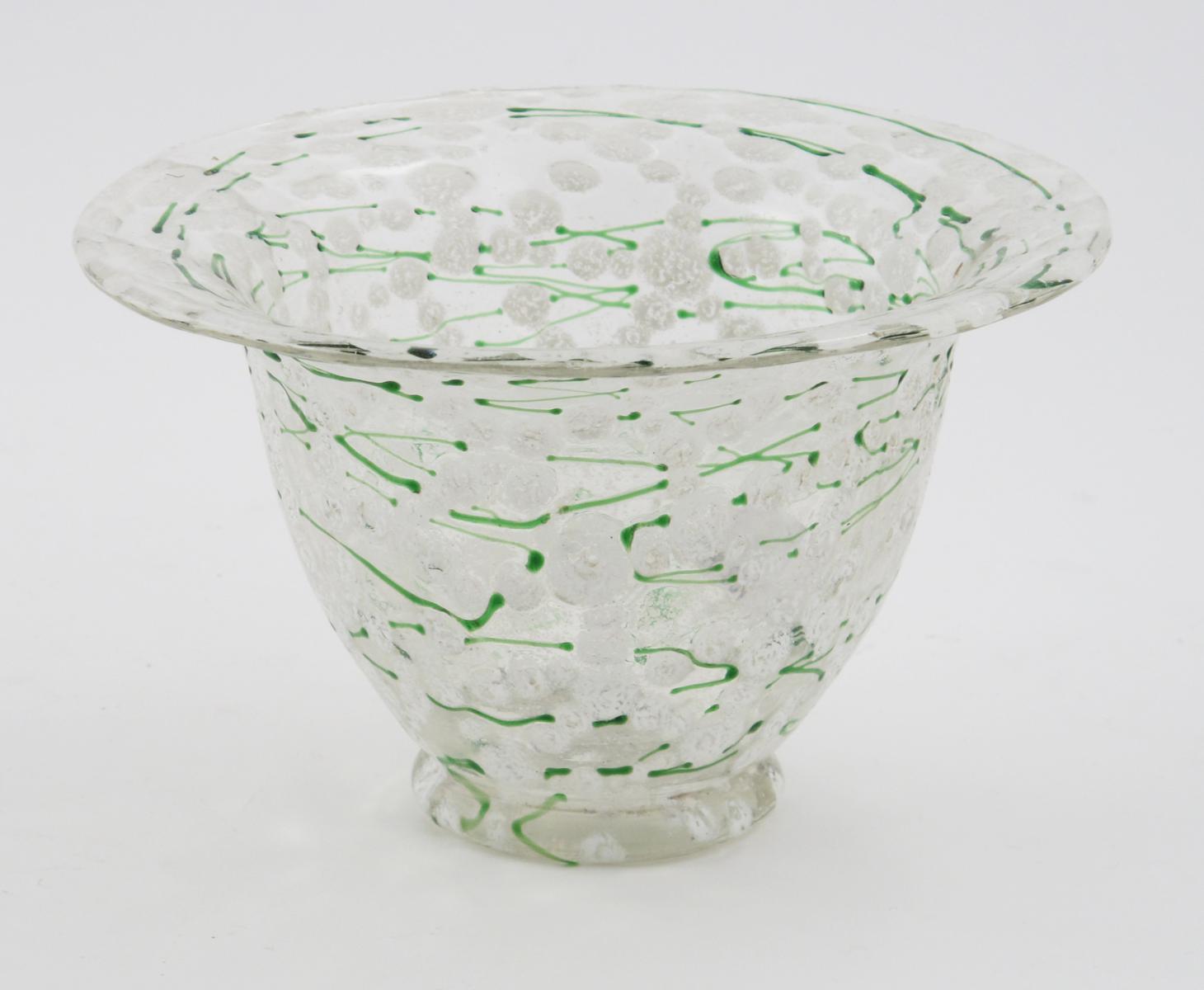 A Loetz glass vase, on applied foot, decorated with white enamel to the surface and green threading 17cm. diam.