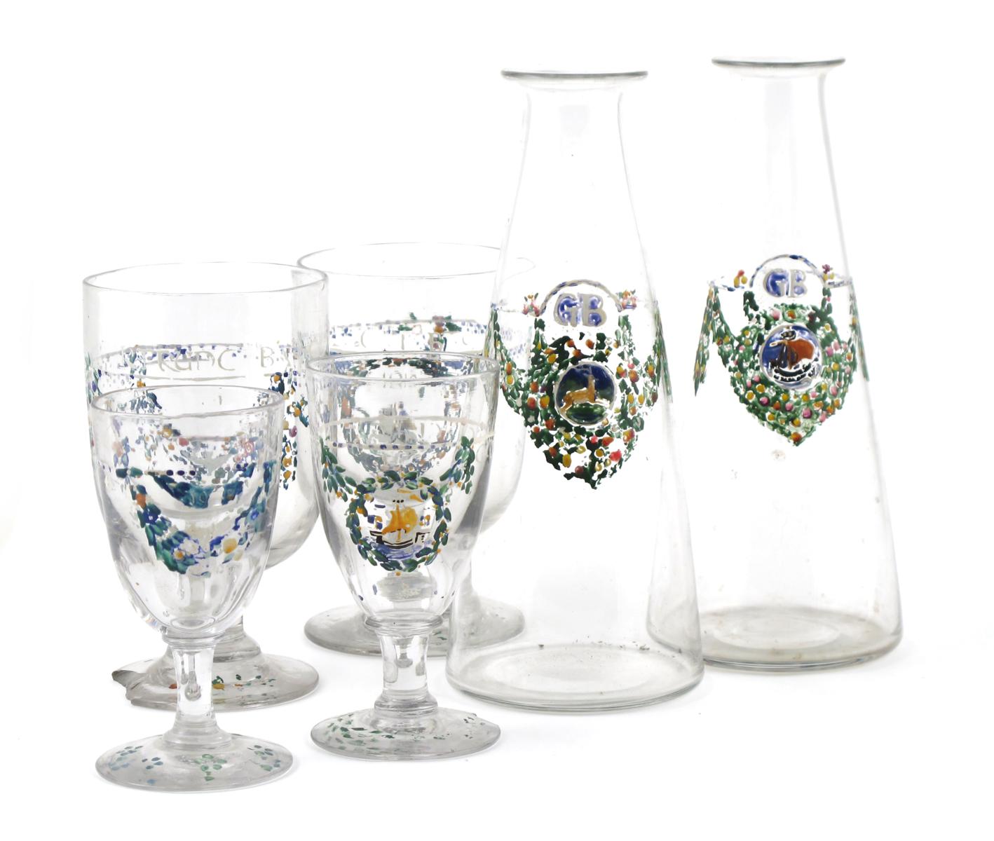 A part set of enamelled wine glasses possibly decorated by Gertrude or Jessie Bayes