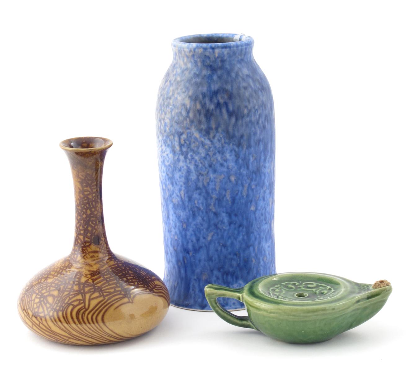 A Linthorpe Pottery vase designed by Dr Christopher Dresser, compressed body with slender neck and everted rim, sand glaze with brown spider's web design, a Liberty pottery oil lamp and a Ruskin vase impressed mark, facsimile signature, professionally restored neck, 23cm. high