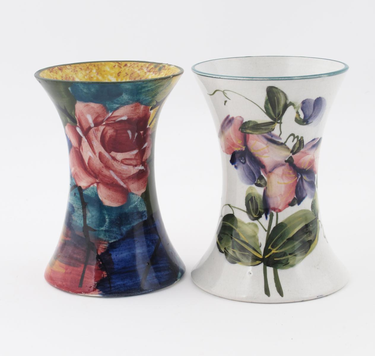A 'Jazzy' Wemyss Pottery vase, waisted form, painted with the Cabbage Rose design on a mottled green, yellow and blue glaze, and a Wemyss 'Sweet-pea' vase painted marks, 11cm. high