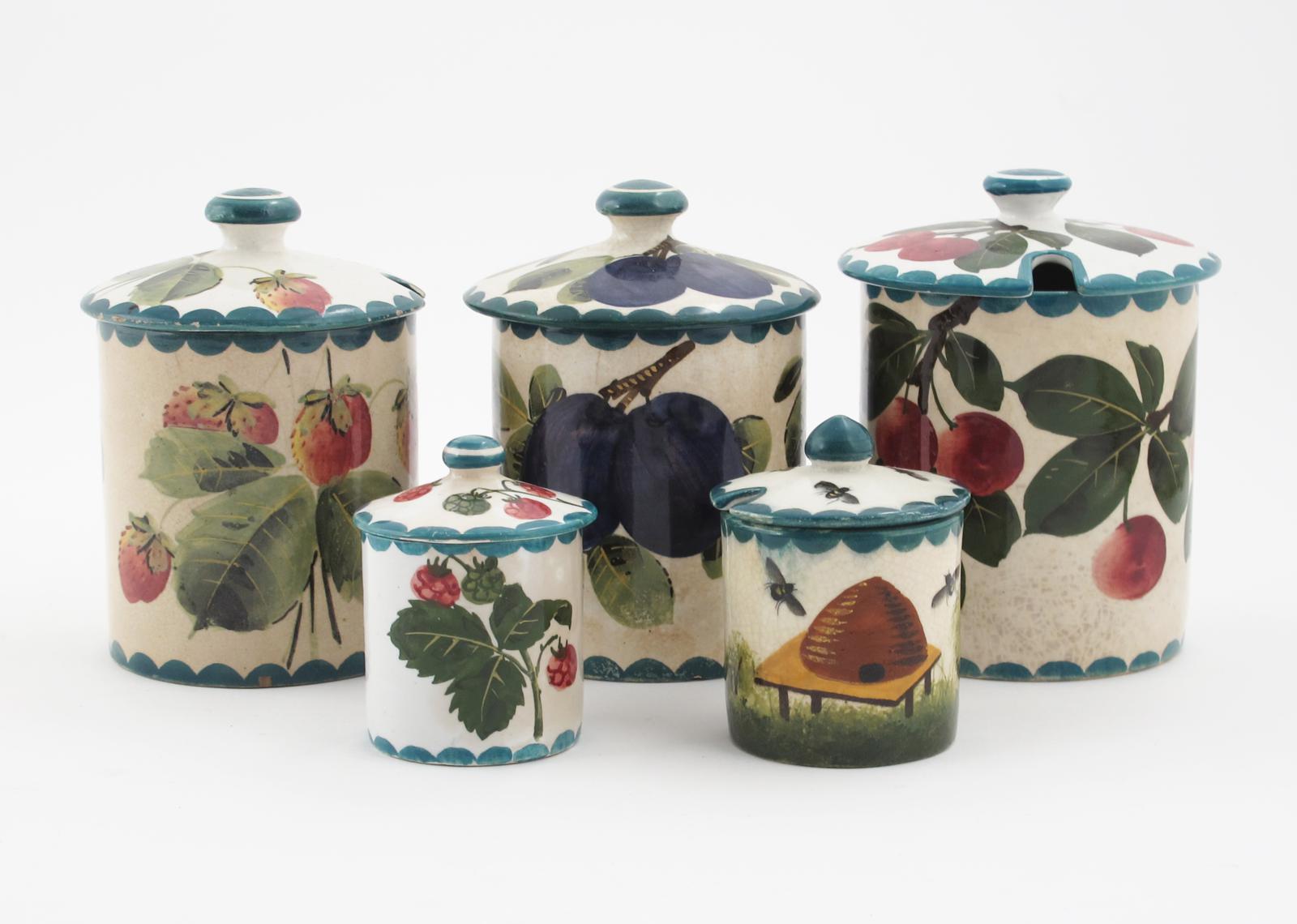 A Wemyss Wild Strawberry pattern preserve pot and cover, cylindrical form, painted in shades of pink, yellow and green, a small Wemyss Raspberry pattern preserve and cover and three other preserve pots and covers painted Wemyss T Goode & Sons, chips 12cm. high